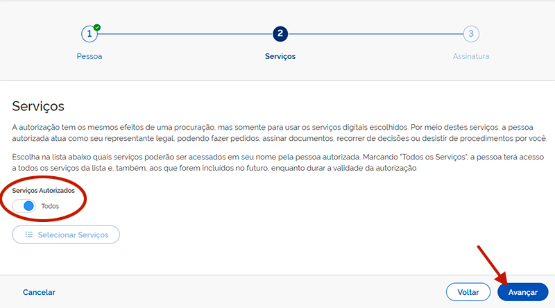 - Em serviços autorizados, marque Todos e clique em Avançar.