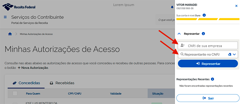 - Na aba que se abriu, digite o CNPJ de SUA empresa e selecione "Representante no CNPJ". Em seguida, clique no botão Representar. Pronto agora você está no perfil de sua empresa e já poderá fazer a autorização de acesso ao Contador Amigo.